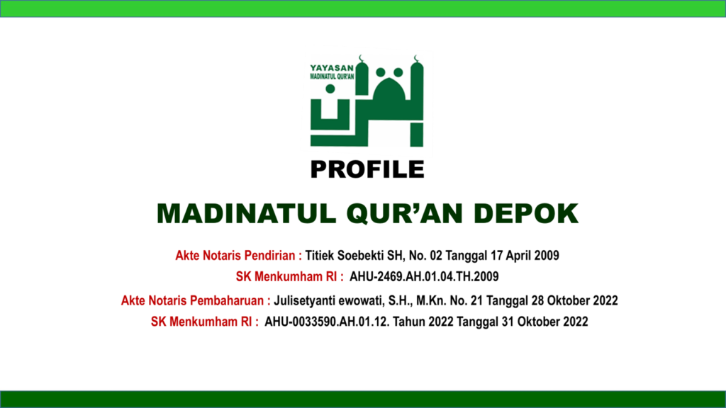 Yayasan Madinatul Qur’an Depok didirikan oleh 11 orang mujtahid dakwah dari berbagai latar belakang, baik pendidikannya maupun pekerjaannya, pada tahun 2009. Ke-11 orang pendiri Yayasan Madinatul Qur’an Depok tersebut adalah Kyai Khoirul Muttaqin, Lc, Al-Hafizh (dai alumni LIPIA dan pembina banyak Majelis Taklim di sekitaran ibukota), Albaini Zuhdi, S.Pd (seorang guru teladan sebuah sekolah negeri di Jakarta), Ali Amril, S.Si, (aktivis KNRP, Komite Nasional untuk Rakyat Palestina), Ir. Arief Surdijanto (pemborong properti), Hendriyadi Chaniago, S.Pd (TU salah satu sekolah Islam terpadu di Depok), Tri Hardiyanto (pegawai swasta), Lutfi, SE (swasta), Dr. Sholihien Hadziq, S.H.I., M.P.I. (guru PAI salah satu sekolah Islam terpadu di Depok), Wardi, S.Pd (guru PAI salah satu sekolah Islam terpadu di Depok), Kyai Zainal Muttaqien (staf pengajar salah satu lembaga tahfizh), dan Oktori Winarno, A.Md (guru salah satu sekolah negeri di kota Depok).
